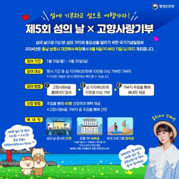 행정안전부는 제5회 섬의 날 행사를 홍보하고, 섬 지역 지자체에 기부를독려하고자 ‘고향사랑기부’에 참여한 기부자에게 호텔 숙박권 등을 제공하는『우리 섬 사랑 기부』 이벤트를 진행한다고 밝혔다.