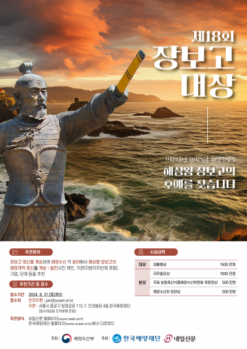 해양수산부는 한국해양재단, 내일신문과 함께 6월 17일(월)부터 8월 31일(토)까지 ‘제18회 장보고대상’후보자를 공모한다.