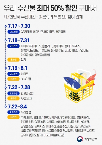 마트·온라인몰에서는 「대한민국 수산대전-여름휴가 특별전」을 개최한다. 이번 행사는 7월 17일(수)부터 8월 4일(일)까지 진행되며, 소비자가 마트(18개사)와 온라인몰(27개사)에서 국산 수산물을 구매할 때 구매금액의 최대 50%를 할인받을 수 있다. 이번 행사는 대중성어종과 바다장어, 우럭, 전복, 멍게 등의 수산물에 대해 할인 혜택을 제공하며, 업체별 할인 품목 등 더욱 자세한 내용은 대한민국 수산대전 공식 누리집(www.fsale.kr)에서 확인할 수 있다.
