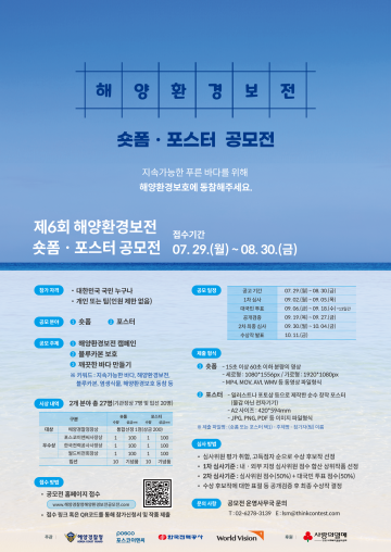 해양경찰청은 “해양환경 보전에 대한 국민의 관심을 유도하고 공감 문화를 조성하기 위해 「제6회 해양 환경보전 숏폼·포스터 공모전」을7월 29일부터 오는 8월 30일까지 개최한다.”라고 밝혔다.