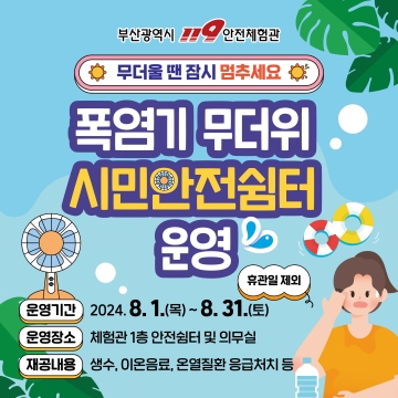 부산119안전체험관은 체험객 및 시민의 편의와 안전을 위하여 무더위 시민안전쉼터를 8월 1일부터 한 달간 운영한다고 밝혔다.