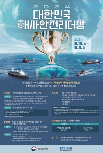해양수산부는 “2024년 대한민국 해사안전 리더상” 선정을 위해 8월 12일(월)부터 9월 6일(금)까지 후보자를 공모한다고 밝혔다.