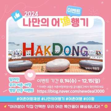 - 어촌연안 활력 제고를 위해 ’24년 하반기 어촌·어항 방문 인증 이벤트 개최(8.14~12.15)