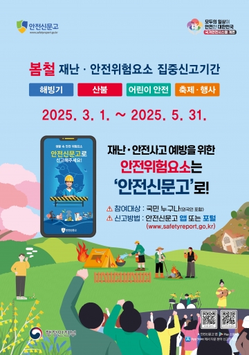 행정안전부는 3월 1일(토)부터 5월 31일(토)까지 안전신문고를 통해 ‘봄철 재난·안전 위험 요소 집중신고 기간’을 운영한다.