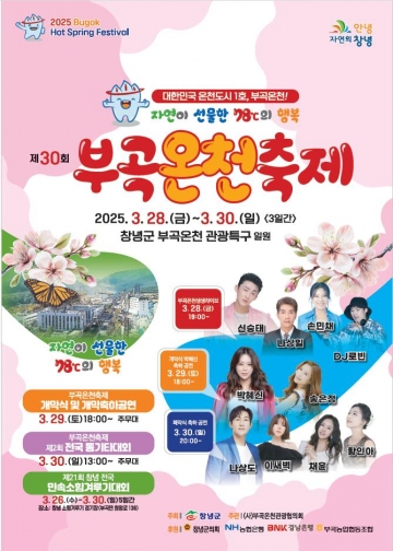 3월 28일부터 30일까지 열리는 부곡온천 축제에서는 ‘생생! 라이브 공연’을 시작으로 덕암산 산신제, 온천수 운송 퍼레이드, 족욕체험, 온천수 계란 삶기 등 다채로운 이벤트도 함께 열린다.