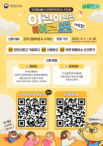 행정안전부는 4월 1일(화)부터 30일(수)까지 ‘어린이 안전히어로즈’를 신규 모집한다고 밝혔다.