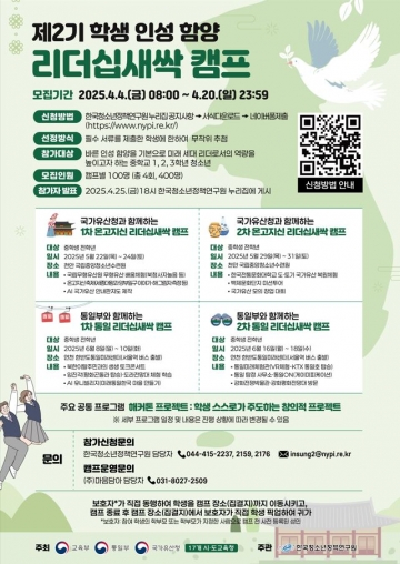 교육부는 ‘제2기 학생 인성 함양 리더십새싹 캠프’ 신청 접수를 4월 4일(금)부터 온라인으로 실시한다고 밝혔다.