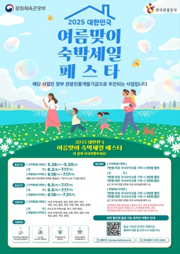문화체육관광부(이하 문체부)는 한국관광공사(이하 공사)와 함께 여름 휴가철에 앞서 국민의 국내 여행을 장려하고 지역경제에 활력을 불어넣기 위한 ‘2025 대한민국 여름맞이 숙박세일페스타’ 행사를 추진한다.