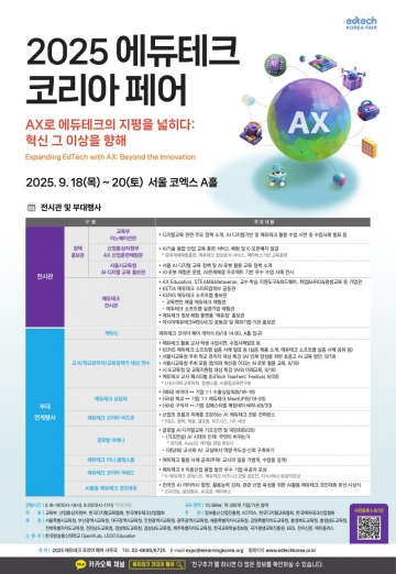 2006년부터 시작된 ‘에듀테크 코리아 박람회(페어)’는 올해 “에이엑스(AX)로에듀테크의지평을 넓히다: 혁신 그 이상을 향해(Expanding EdTech with AX: Beyond the Innovation)”를 주제로 열린다. 이번 행사에는 전 세계 16개국 약 300여개기업이 참여하며, △에듀테크 기업 전시관, △교육부, 산업부,시·도교육청 정책 홍보관, △에듀테크 소프트랩 홍보관, △학교-기업 1:1 상담부스 등 다양한전시관 및 부대행사 등이 다채롭게 운영될 예정이다.