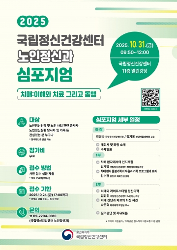 - 국립정신건강센터, 「치매: 이해와 치료 그리고 동행」 심포지엄 개최(10.31)