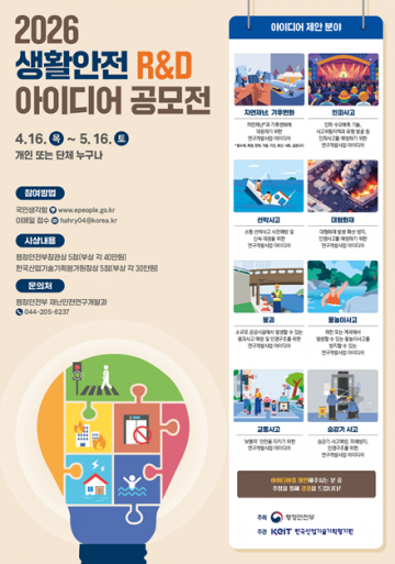 행정안전부는 4월 16일(목)부터 5월 16일(토)까지 ‘2026년 생활안전 R&D 아이디어 공모전’을 실시한다.